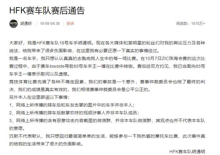 总而言之,胡通明认为自己在这起摔车事件中没有任何过错,只是一个意外,而网络传闻的一切都跟他及他的车队没有关系。