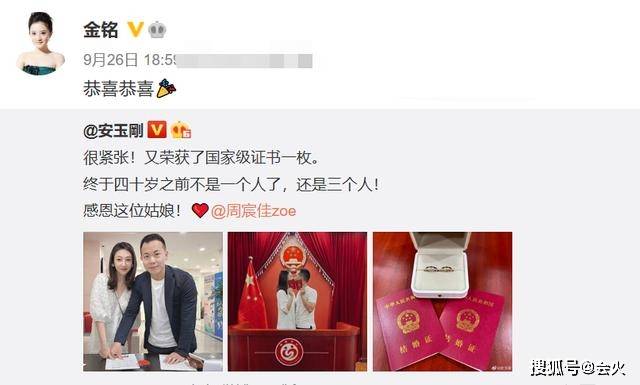 虽然在随后的几年,金铭表示安玉刚只是同学关系,安玉刚也多次对恋情否认,却一直到今年的9月26日,安玉刚在个人社交平台发了结婚照宣布自己结婚,才让这段绯闻终结。金铭转发了安玉刚的动态并大方送上祝福,安玉刚也互动表示希望金铭也加油。