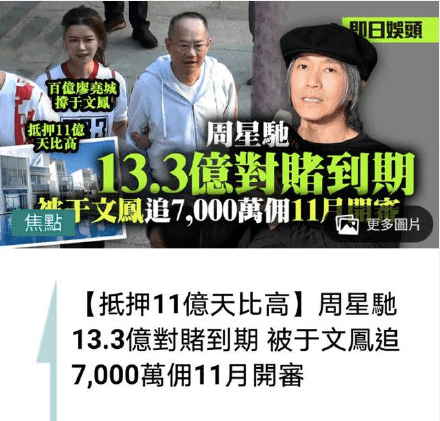 然而,6月18日据港媒报道,周星驰传出因为之前签下的对赌协议到期,利润不达标需要作出赔偿,因此抵押了自己市值11亿的豪宅。此外,前女友于文凤也向周星驰追讨七千万佣金,将于11月开审。于文凤称自己由02年起担任星爷个人财务顾问,除了每月的报酬外,跟星爷有口头协议,会就获利项目支付除税后利润10%作为佣金,可是12年星爷付一千万后,至今没付尾数。