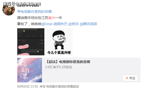 近日,微博上爆料《你是我的荣耀》高中时候的戏份将在顾漫的母校宜兴一中开拍,宜兴一中的内部人员也透露了剧组多次与校方进行协商,双方为了不影响学生学习,时间尽量在推到了周末,而顾漫也特地来到了母校查看了一番。
