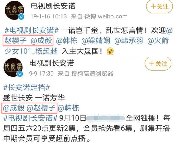 近日,成毅担任主演的网剧《长安诺》开播,去年官宣阵容时,女主赵樱子还是一番,名字在成毅之前。而如今成毅走红,剧方宣布定档时就将成毅的名字放在第一位,压番女主成为一番。