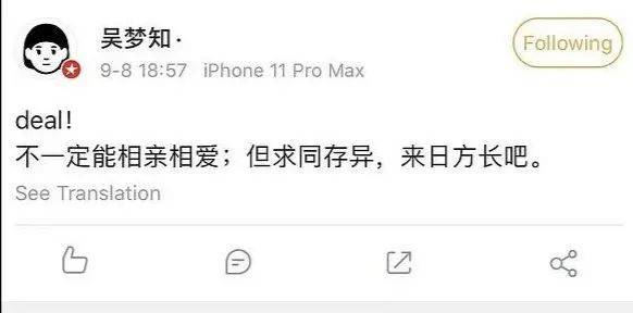 9月8日,“浪姐”总导演吴梦知发文:deal!不一定能相亲相爱;但求同存异,来日方长吧!这条亲自回应的动态发出后不久,吴梦知迅速秒删。