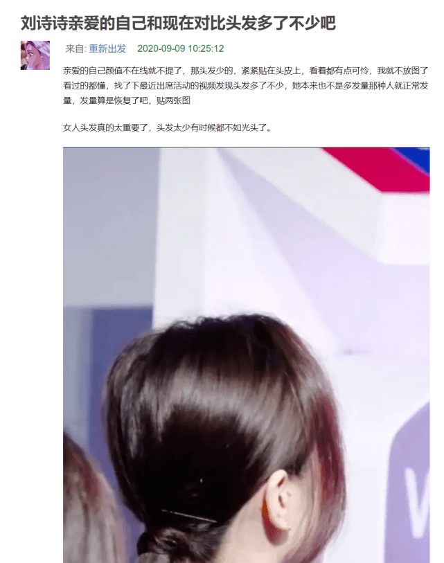 9月9日,有网友发帖心疼刘诗诗:“刘诗诗新剧里和现在对比头发多了不少吧?新剧那头发少的,紧紧贴在头皮上,看着都有点可怜,我就不放图了看过的都懂。”该网友还表示刘诗诗现在的发量恢复了不少,最起码是正常发量。