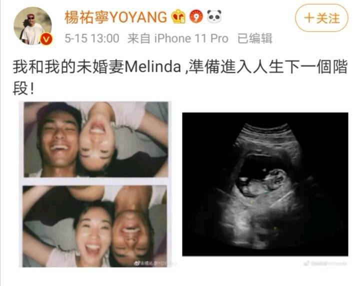 其实早在今年5月15日的时候杨祐宁就宣布了未婚妻怀孕的喜讯并配文“我和我的未婚妻Melinda ,准备进入人生下一个阶段”并且还配上了产检的照片。