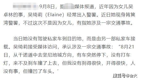 其实,吴绮莉此前常因女儿吴卓林的事情出入警局,但这一次却是自己的原因,接受媒体访问时,她透露当时开车,前面有一辆车突然停下,没有打车灯,来不及刹车撞了上去,所幸她没有开得太快,只是撞凹了车头,人没有事。