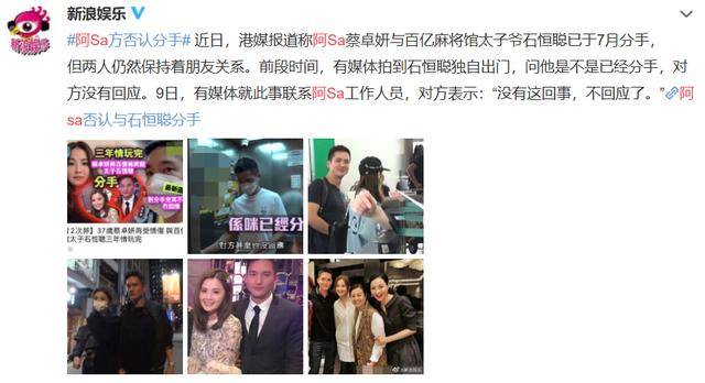最近阿娇和阿Sa两姐妹花运气不佳啊,前两天阿娇刚被曝出在酒店意外受伤,阿Sa这边又被曝出分手传闻,虽然阿Sa方工作人员表示没有这回事,不过似乎说服力不够,石恒聪方也态度不明。
