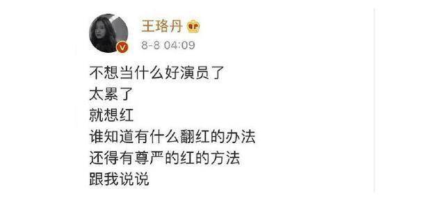 前一阵子,王珞丹发文:不想当什么好演员了,太累了,就想红,在线求问有什么有尊严翻红的方法。随后她删了这条博文。