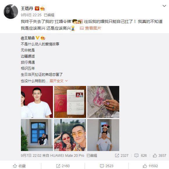 昨天,王珞丹亲姐姐王楚涵晒出结婚照和结婚证,宣布结婚。随后王珞丹转发姐姐的微博,并配文:“终于失去了我的“扛婚令牌”。