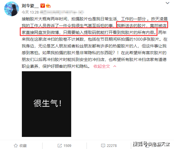 9月9日,知名女艺人刘令姿就发文表示自己送去冲扫的照片,遭到了无良商家的泄露,对方在未经同意的情况下把她的照片上传到了网盘并分享到了微博,路人只需要输入提取码就能看到所有照片。