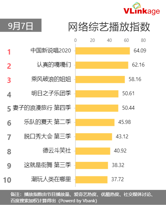 【网综榜单】9月7日当日#网络综艺播放指数#:1.#中国新说唱2020# 播放指数 64.09 2.#认真的嘎嘎们# 3.#乘风破浪的姐姐# 4.#明日之子乐团季# 5.#妻子的浪漫旅行 第四季# 6.#乐队的夏天 第二季# 7.#脱口秀大会 第三季# 8.#德云斗笑社# 9.#这就是街舞 第三季# 10.#潮玩人类在哪里#