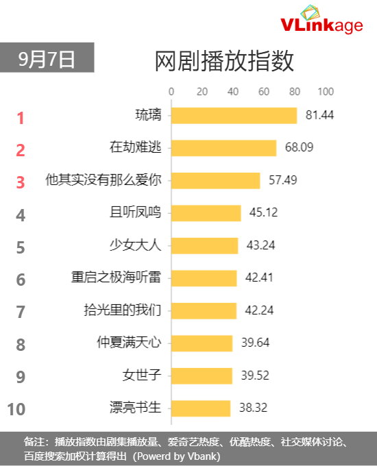 【网络剧榜单】9月7日当日#网剧播放指数#:1.#琉璃# 播放指数 81.44 2.#在劫难逃# 3.#他其实没有那么爱你# 4.#且听凤鸣# 5.#少女大人# 6.#重启之极海听雷# 7.#拾光里的我们# 8.#仲夏满天心# 9.#女世子# 10.#漂亮书生#