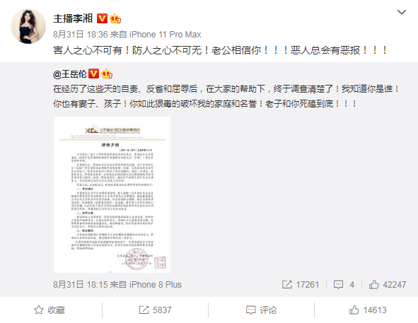 不管怎样,李湘是彻底打消了对王岳伦的疑虑,还亲自帮他转发了微博力挺老公提告。